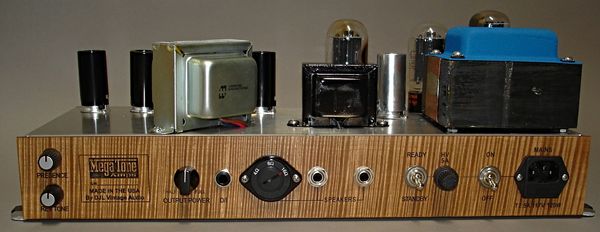 30 watts class-A cathode biased, variable control of phase inverter, pentode in one channel, black face Fender style 2nd channel, and spring tank reverb.